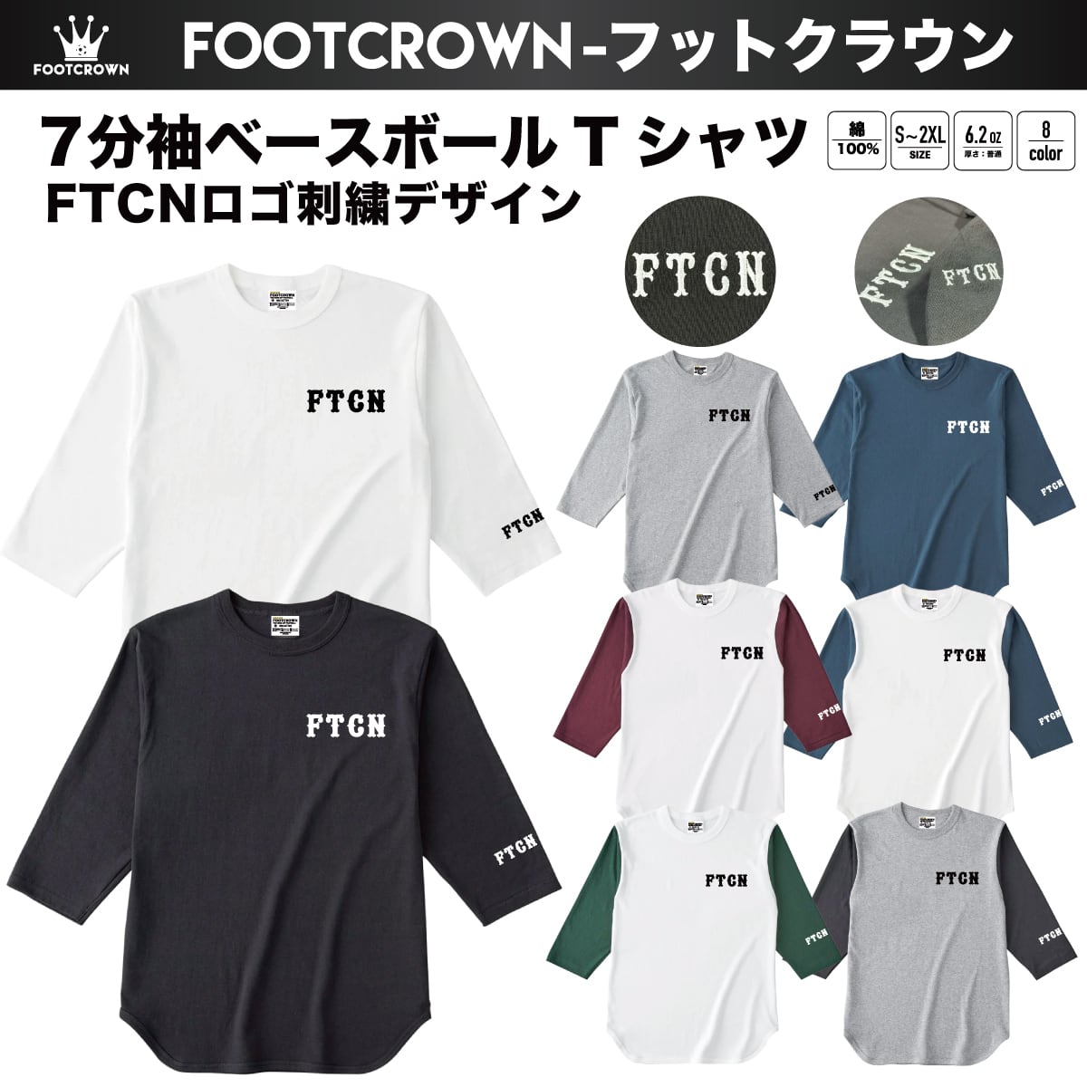 7分袖ベースボールTシャツ FTCN 刺繍ロゴ 6.2onz S~2XL 2025秋冬