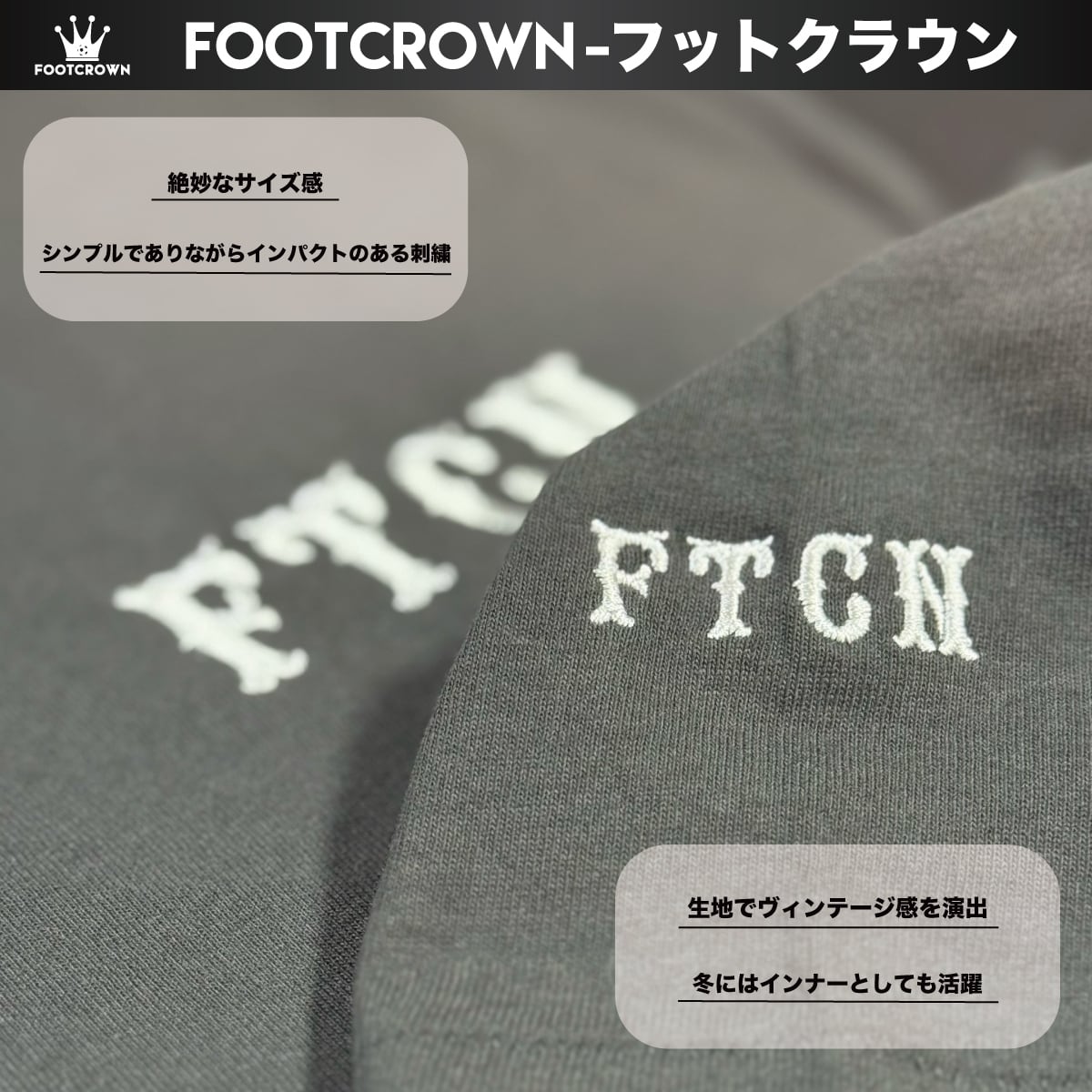 定番ラインであるFTCNロゴの刺繍を2箇所施してあり、シンプルでありなからもインパクトのある仕上がりに。